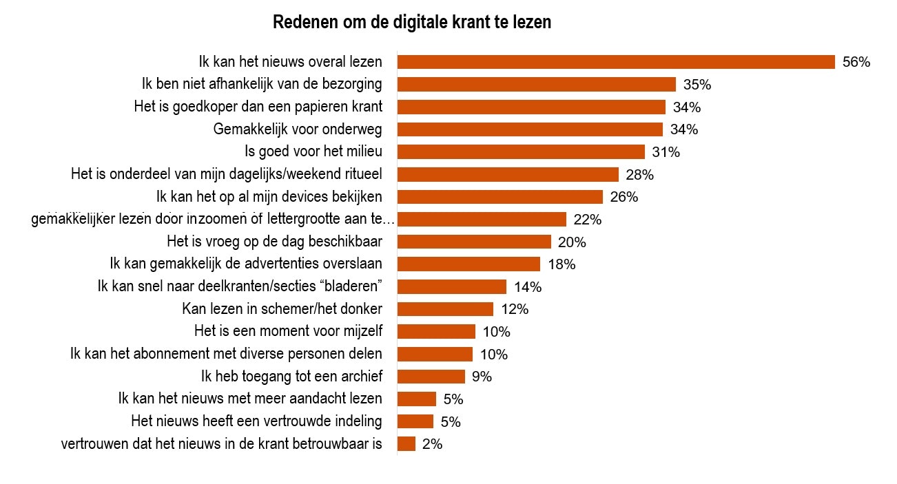 De meest genoemde reden voor gebruik is dat je de digitale krant overal kunt lezen. Men is niet afhankelijk van bezorging en ervaart de digitale krant als milieuvriendelijker en voordeliger. Slechts 2 op 10 lezers wijzen op het gemak om advertenties te kunnen skippen.